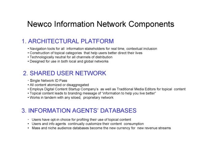 - An outline of the reasons why traditional media need a new collaboration of local markets working in tandem with a global shared-user network for trust, identity, privacy and information commerce. An "information newco" is proposed. Buzz Wurzer.